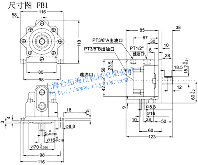 壓力MPa在1800r/min,黏度20cst時(shí)的特性 容許轉(zhuǎn)數(shù)r/min 重量kg 流量?/rev 功率Kw 0.5MPa 3.5MPa 7MPa 0.5MPa 3.5MPa 7MPa 最高 最低 法蘭型 腳座式 FB1-05 4.3 7 7.7 7.2 6.5 0.20 0.75 1.5 2200 600 3.5 4.5 FB1-07 7.0 12.6 11.8 11 0.25 1.05 2.1 FB1-12 12.3 22.7 21.6 21.0 0.35 1.65 3.4 低壓定量葉片泵FB1尺寸圖