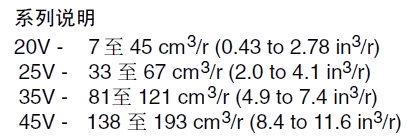 57,60,66,75備注:1、排量代號(hào)是在1200r/min和0.69Mpa(100psi)下的額定USgpm。2、對(duì)于上面所列以外的選擇,即安裝、排量、油口和軸伸請(qǐng)來(lái)電。3、轉(zhuǎn)速限制:a.最低轉(zhuǎn)速,所有型號(hào)和油液搭配600r/min。b.最高轉(zhuǎn)速:標(biāo)準(zhǔn)型號(hào)用抗磨液壓油1800r/min;標(biāo)準(zhǔn)型號(hào)用合成液和油包水乳化液1200r/min;用水乙二醇的型號(hào)1500r/min。