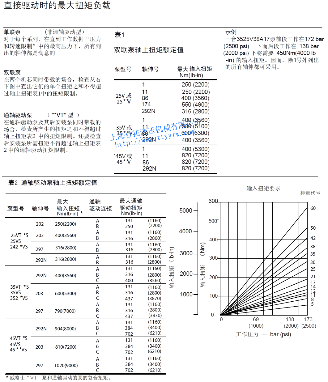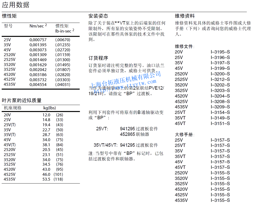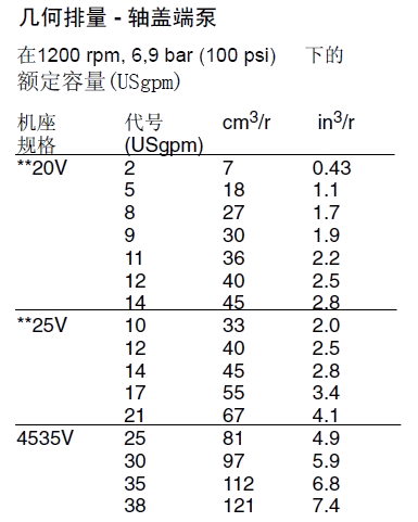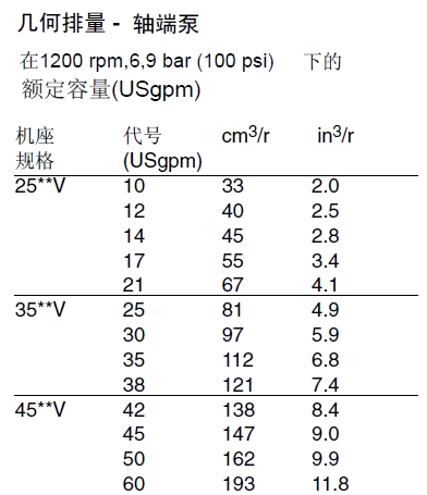 備注:1、排量代號(hào)是在1200r/min和0.69Mpa(100psi)下的額定USgpm。2、轉(zhuǎn)速限制:a.最低轉(zhuǎn)速,所有型號(hào)和油液搭配600r/min。b.最高轉(zhuǎn)速:標(biāo)準(zhǔn)型號(hào)用抗磨液壓油1800r/min;標(biāo)準(zhǔn)型號(hào)用合成液和油包水乳化液1200r/min;用水乙二醇的型號(hào)1500r/min。