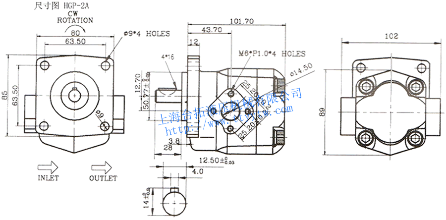 產(chǎn)品型號 吐出量cc/rev 壓力bar(psi) 轉(zhuǎn)速rpm 重量kg 工作 最高 Rate 最高 最低 HGP-2A-*2* 2 210(3000) 250(3500) 1800 5000 900 1.69 HGP-2A-*2.5* 2.5 850 1.70 HGP-2A*3* 3 1.70 HGP-2A-*4* 4 4500 800 1.71 HGP-2A-*5* 5 3500 700 1.71 HGP-2A-*6* 6 1.72 HGP-2A-*8* 7.5 3000 600 1.74 HGP-2A-*9* 9 2500 550 1.74 HGP-2A-*11* 10.5 2000 500 1.74 HGP-2A-*12* 12 175(2500) 210(3000) 1.76 定量齒輪泵HGP-2A系列尺寸圖