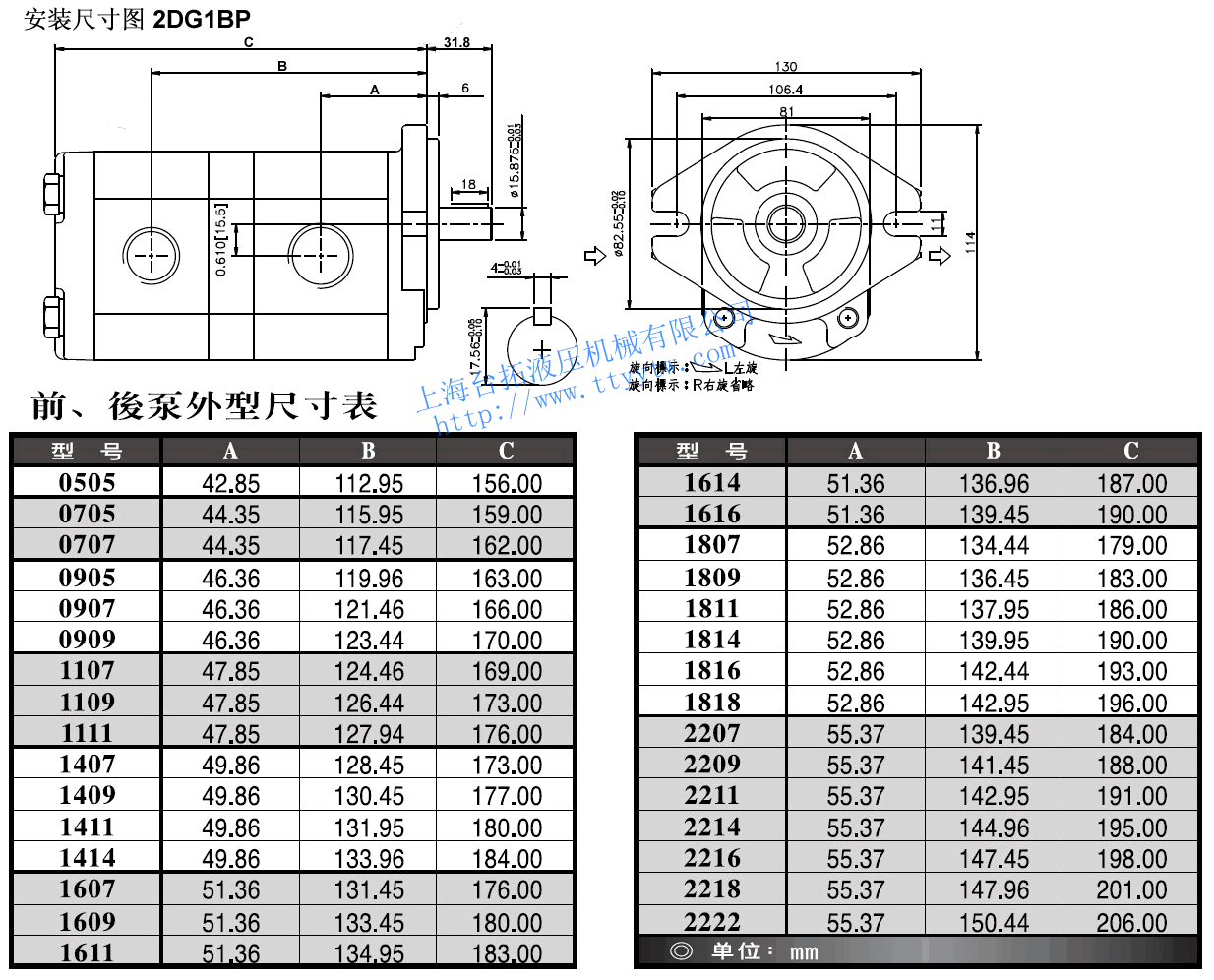 kg前泵 后泵 前泵 后泵 前泵 后泵 前泵 后泵L 2DG1BP0505 5.0 5.0 21 3500 PT1/2" PT1/2" PT3/4" 無 PT3/4" PT3/4" 10.27 2DG1BP0705 7.0 5.0 10.44 2DG1BP0707 7.0 10.60 2DG1BP0905 9.5 5.0 10.58 2DG1BP0907 7.0 10.85 2DG1BP0909 9.5 11.06 2DG1BP1107 11.3 7.0 11.03 2DG1BP1109 9.5 11.24 2DG1BP1111 11.3 11.39 2DG1BP1407 14.0 7.0 11.23 2DG1BP1409 9.5 11.45 2DG1BP1411 11.3 11.60 2DG1BP1414 14.0 11.79 2DG1BP1607 16.0 7.0 PT 1" 11.44 2DG1BP1609 9.5 11.64 2DG1BP1611 11.3 11.80 2DG1BP1614 14.0 11.99 2DG1BP1616 16.0 12.16 2DG1BP1807 18.0 7.0 18 11.63 2DG1BP1809 9.5 11.84 2DG1BP1811 11.3 12.00 2DG1BP1814 14.0 12.18 2DG1BP1816 16.0 12.36 2DG1BP1818 18.0 12.56 2DG1BP2207 21.5 7.0 11.90 2DG1BP2209 9.5 12.11 2DG1BP2211 11.3 12.26 2DG1BP2214 14.0 12.45 2DG1BP2216 16.0 12.62 2DG1BP2218 18.0 12.84 2DG1BP2222 21.5 13.11 高壓雙聯(lián)齒輪泵2DG1BP尺寸圖