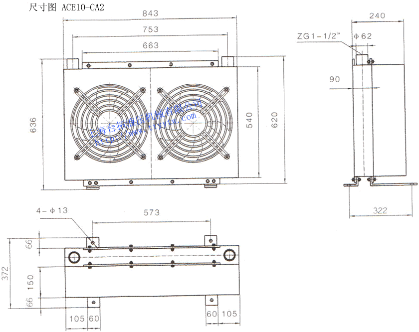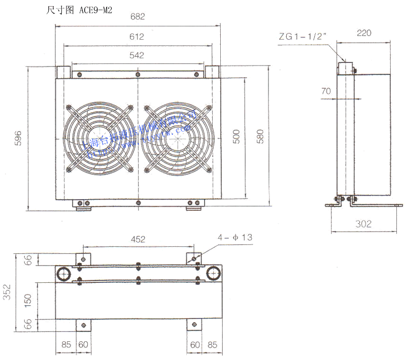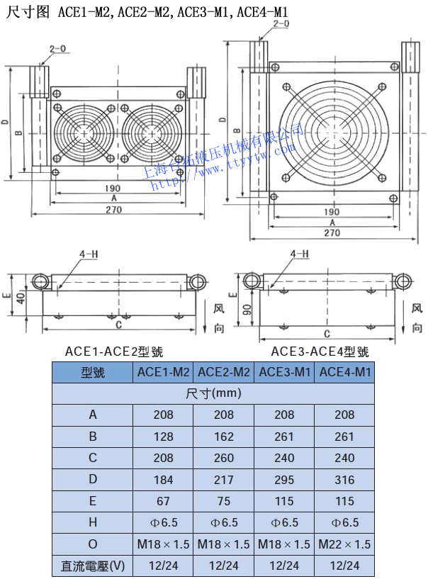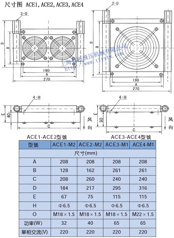 型號(hào) 牙口ZG 通過(guò)量?/min 工作壓力MPa 最高壓力MPa 風(fēng)扇功率W ACE1-M2 M18×1.5 10 2.0 2.5 30 ACE2-M2 M18×1.5 20 2.0 2.5 40 ACE3-M1 M18×1.5 25 2.0 2.5 65 ACE4-M1 M22×1.5 30 2.0 2.5 65 ACE4-M2 M22×1.5 60 2.0 2.5 130 ACE5-M1 M27×1.5 55 2.0 2.5 100 ACE6-M1 M27×2 100 2.0 2.5 200 ACE7-M1 M33×2 120 2.0 2.5 100 ACE8-M1 M33×2 160 2.0 2.5 200 ACE9-M2 ZG1-1/2" 250 2.0 2.5 200 ACE10-M2 ZG1-1/2" 300 2.0 2.5 400 ACE11-M3 ZG1-1/2" 400 2.0 2.5 600 風(fēng)冷機(jī)ACE系列外形尺寸圖