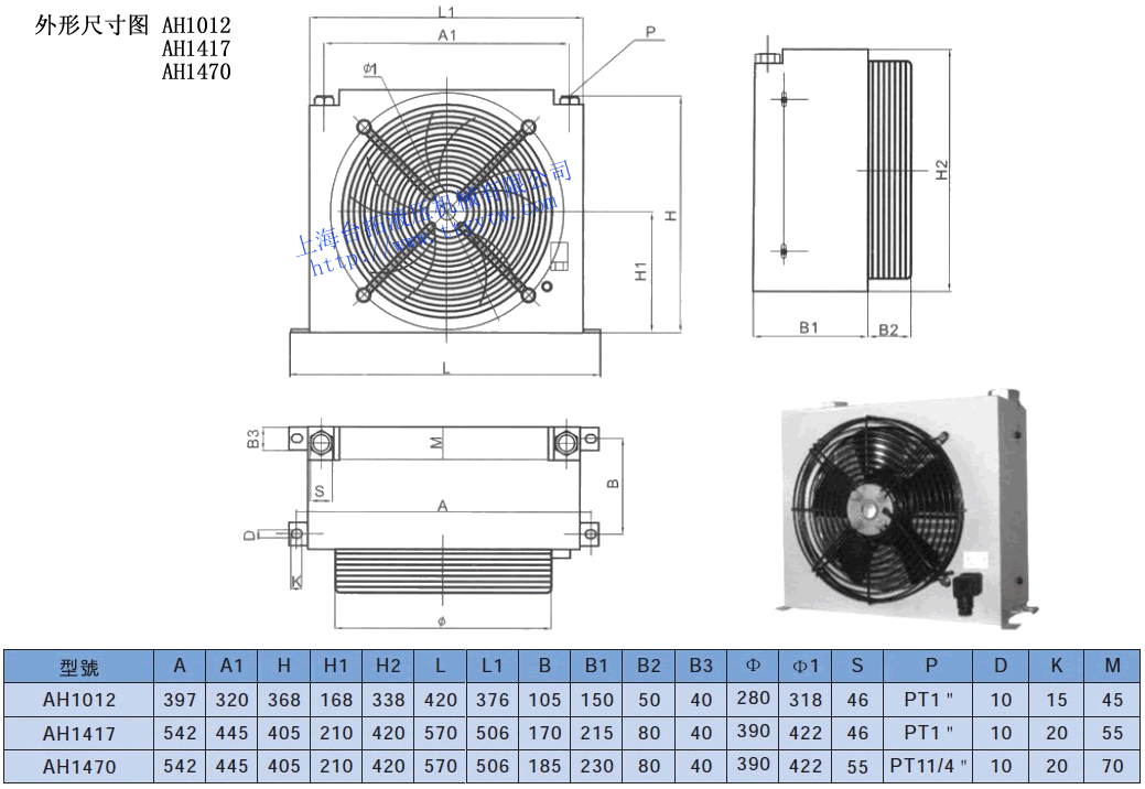 風(fēng)冷機(jī)AH1系列:工作壓力2MPa,流量30?/min-300?/min,適用于變量泵的泄油冷卻。
