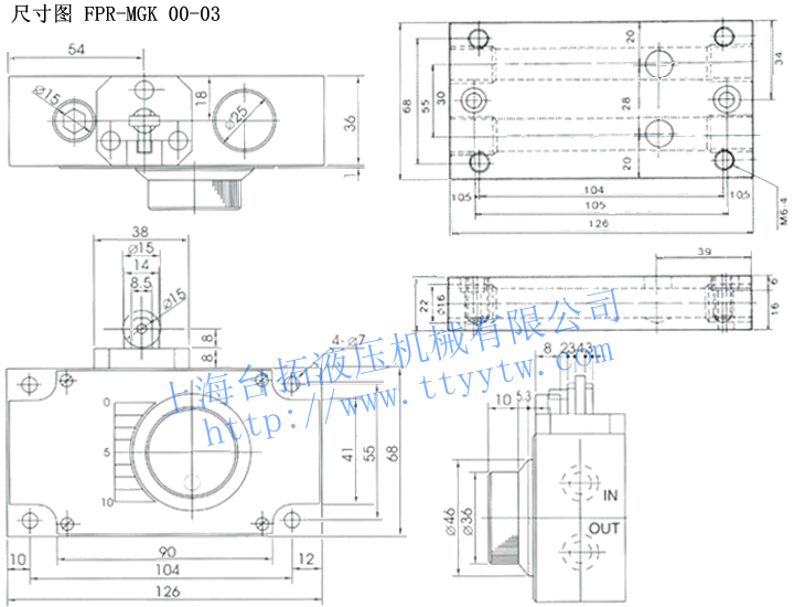 型 號 流量調整范圍?/min 最高使用壓力kg/cm2 自由流量?/min 接線口徑 FPR-MGK 002-03 0.1~2 70 30 PT 3/8 FPR-MGK 004-03 0.1~4 FPR-MGK 008-03 0.1~8 - 調速閥FPR-MGK尺寸圖