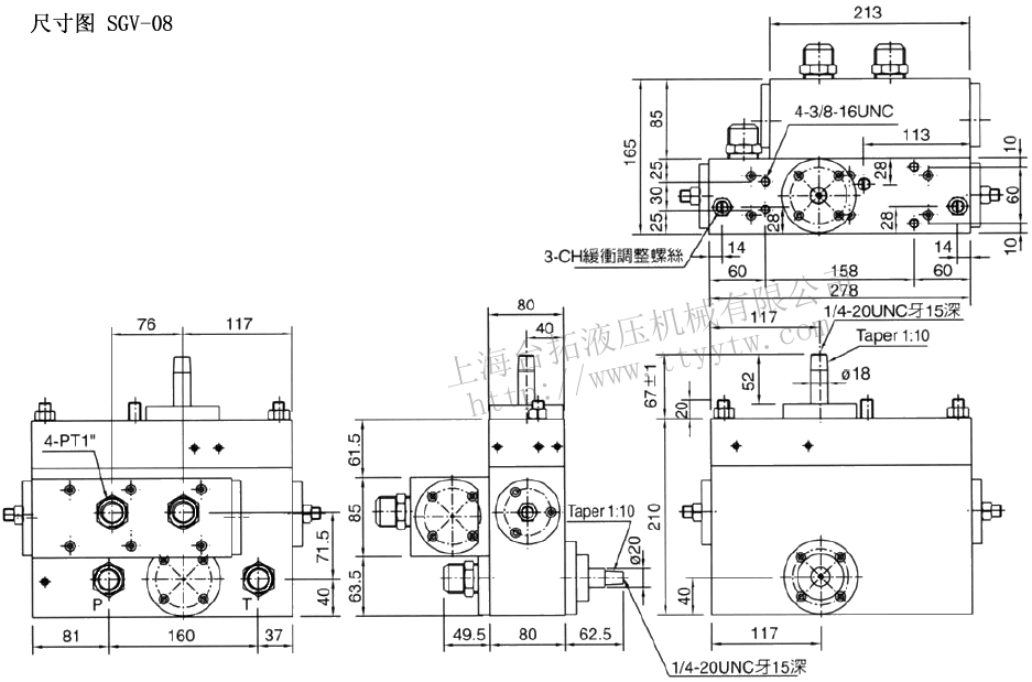 型號 最大流量?/min 最大壓力MPa 口徑 SGV-08-100 140 4 PT 1 " SGV-08-125 140 機械式方向閥SGV-08尺寸圖