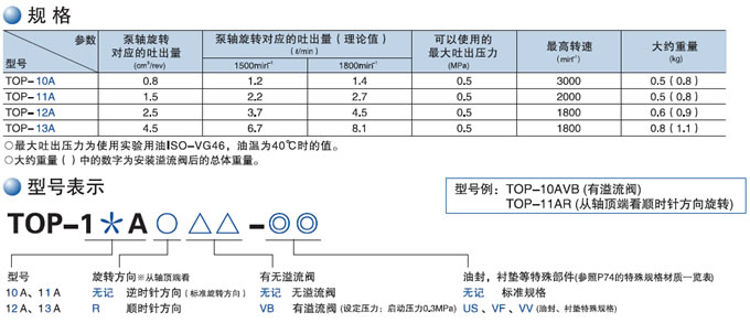 NOP擺線(xiàn)齒輪泵TOP-1A泵單體是一款小型、輕量、小吐出量(0.8~4.5cm3/rev)、低吐出壓油泵。可安裝內(nèi)部溢流閥,用于輸送操作油、潤(rùn)滑油,液體溫度:-5~80℃(有高溫用特殊部件)。
